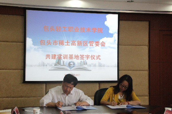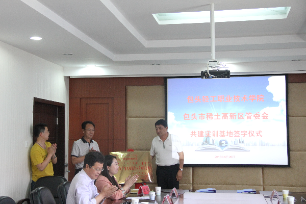 2015年6月26日,我校与包头市稀土高新区管委会共建实训基地签字仪式在学校办公楼301室举行。