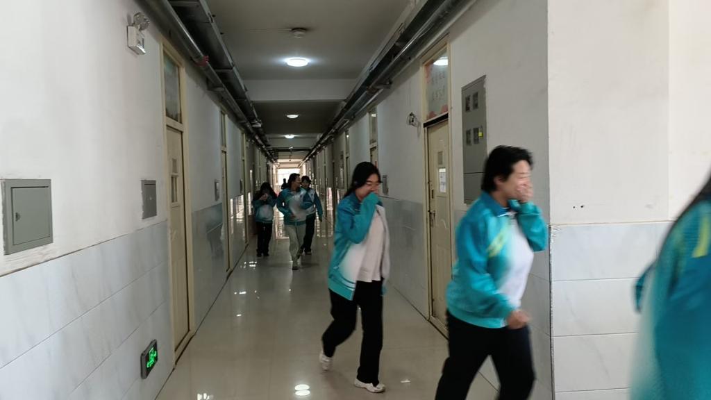 14点 40 分演练开始,全体学生在哨声的指挥下,各宿舍长组织本宿舍成员,迅速进入紧急疏散状态,学生们遵循弯腰、低头、捂口鼻的指令按照逃生演练方案设定的逃生路线迅速有序的撤出宿舍,没有出现拥挤、踩踏等安全事故。