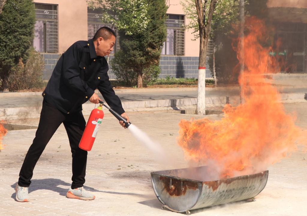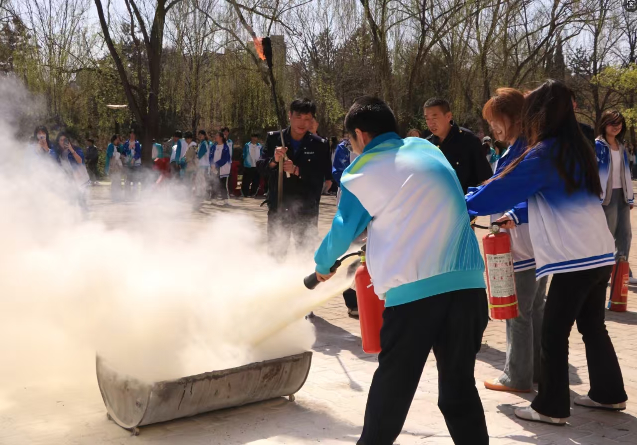 人员到达目的地后,各班快速整队并核查人数。安全管理处尚斌奇老师讲解安全知识与灭火器的使用方法。随后,各班选出代表进行灭火实践演练。