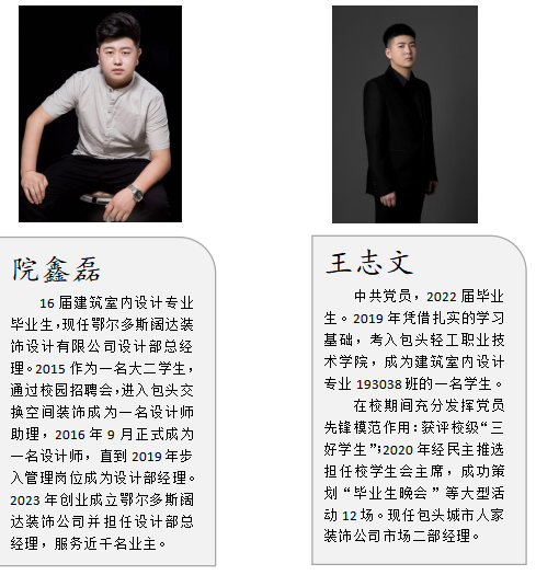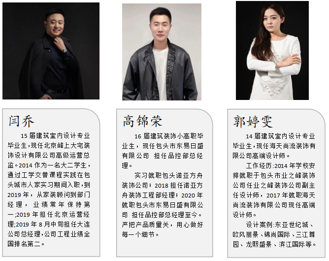 毕业生就业主要面向北京、大连、山东、呼和浩特、包头、鄂尔多斯等区内外各类装饰公司,学生从事装潢设计、制作、管理等一线的装潢设计师(助理)、绘图员、家装顾问、家装监理等岗位的工作。学生就业率连续5年均在98%以上,就业2-3年学生薪资可达月8000-10000元! |